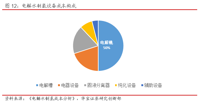 电解槽的成本是电解水制氢系统的核心部件,也是设备成本的主要构成。电解水制氢系统由电解槽及辅助系统组成,其中电解槽是电解反应发生的主要场所,辅助系统则包括电力转换、水循环、气体分离、气体提纯等模块。从成本构成来看,电解槽在制氢系统总成本中的占比约为50%,而且设备在单位时间内的产氢量越大,电解槽所占整个设备制造成本的比例就越高,所以电解槽的成本会直接影响制氢系统的产品价格。电解槽的成本是电解水制氢系统生产成本的核心。