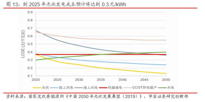 通过对制氢成本的拆解可知,电解水制氢成本主要来自电耗成本和折旧成本。从这两方面来看,随着电价的降低,电解制氢成本业随之降低,同时电力成本的占比也同步降低,此外,随着电解槽每年工作时间的延长,由于单位氢气固定成本的降低,也将带动制氢成本的下降。一方面,在光伏电站投资下降、技术进步带动系统效率提升和光衰降低等驱动下,光伏发电成本也快速下降。根据国家发改委的《中国2050年光伏发展展望(2019)》的预测,到2025年光伏发电成本预计将下降至0.3元/kWh,到2035年和2050年光伏发电成本相比当前预计下降50%和70%,达到0.2元/kWh和0.13元/kWh。另一方面,随着技术进步,电解槽工作时长也会有所提升至5000小时以上。电价下降和技术进步均会带动电解水制氢成本的下降,基于此,下面我们将分别对碱性电解水制氢和PEM电解水制氢进行降本测算。