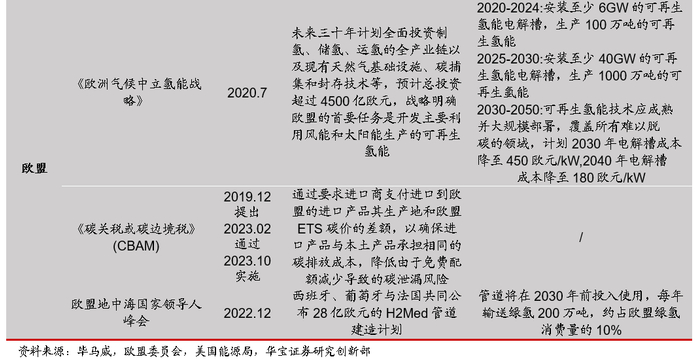 欧洲:绿氢政策逐步落地,绿氢进入实质发展阶段。欧盟规划2025-2030年安装至少40GW可再生氢能电解槽(至2024年达到6GW),生产1000万吨可再生氢能,并通过碳关税支持氢能发展。22年12月,西班牙、葡萄牙和法国启动H2Med能源互联项目,氢气管道预计每年运输200万吨绿氢,并将于2030年投入使用,绿氢进入实质发展阶段。此外,2023年3月,欧盟正式启动氢能银行计划,目的之一是在缺乏需求的情况下,尽量弥补并降低绿氢成本,初步预算8亿欧元项目招标,最高达4欧元/kg(4.36美元)补贴,将4欧元/lg(4.36美元)作为投标的最高限价,此补贴高于美国3美元/kg的绿氢补贴,且对投标人做出高于5kW电解槽安装容量的要求,并期望所有中标项目在拍卖后的3.5年内产能达100%。高补贴、大容量装机以及完成时间的预期,体现了欧盟发展绿氢的积极与迫切性,且此仅为欧洲氢能银行2024年启动耗资30亿欧元前的试点项目,欧盟大力推进绿氢发展无可置疑。