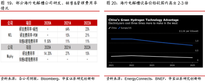 海外市场需求高速增长,中国企业出海具备优势。海外氢能发展已进入实质阶段,目前以天然气制氢为主,据欧盟官网2022年欧洲天然气制氢占比96%,但在俄乌冲突影响下,天然气短缺价格高涨,2022 年均价到了 6700 元/吨,相比2021/2020 年增长 37%/106%,天然气价格保障催化更具性价比的绿氢需求。欧美发达国家均发布了相关政策大力支持绿氢发展,欧洲2020年发布的《欧洲氢能战略》中的第一阶段目标即在2024年前,全欧的绿氢制备总功率达到6GW,绿氢年产量超过100万吨,而预计2022年欧洲绿氢产量不足10万吨,还具有较大发展空间;美国也规划了绿氢项目,按计划将在2024-2026年逐步投产,预计今年明年大部分项目将确定开建。从成本角度来看,根据BNEF,海外电解槽设备价格较国内高出 2-3 倍,主要系海外人工成本高于国内,欧美电解槽企业研发费率、销售&管理费率水平均较高,通常大幅高于国内水平,带来成本增加。在海外需求加速的大背景下,我们认为中国企业凭借高性价比的产品出海具备优势,有望未来在国际市场快速崛起。