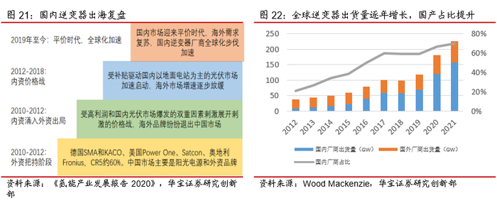 我们认为电解槽未来可以复制逆变器的发展路径,未来有望加速出海获得广阔的国际市场。从产品特点来看,国内厂商均具有充分的技术储备,电解槽和逆变器都不具备较高的技术门槛,中国企业有望发挥后发优势;从市场特点来看,目前电解槽也位于从0到1起步的过程,未来市场需求有望保持较高增速。因此以国内逆变器出海作为类比,下文我们对逆变器的出海历史进行了复盘以期对未来电解槽的出海发展做出展望。