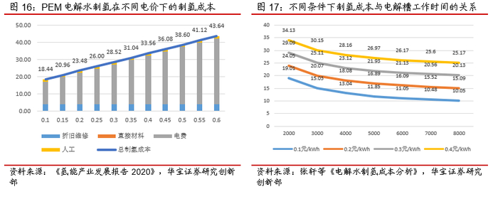 电费成本和设备折旧成本是绿氢的主要成本构成。碱性电解水的电费成本占绝大多数,占比86%,其次是折旧维修占比10.34%,人工和直接材料各占3.27%和0.2%。PEM电解水制氢的电费和折旧维修成本占比69.21%和27.69%,人工和直接材料各占2.92%和0.18%。因此,从成本构成来看,电解水制氢未来的降本主要来自于电费成本和折旧维修成本这两大方面。