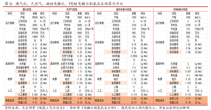 成本是目前制约绿氢市场空间的最主要因素。我们对煤气化、天然气、碱性电解槽制氢及PEM电解槽制氢进行成本测算后发现,四者制备成本分别为9.61元/kg、16.52元/kg、25.01元/kg及31.04元/kg,目前电解水制氢的成本远高于煤气化和天然气制氢,正因此其优势难以得到体现。