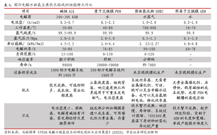 碱性电解槽凭借成本优势仍是主流技术路线,长期来看PEM电解槽优点众多。当前电解水制氢工艺主要有碱性电解、质子交换膜(PEM)电解、固体氧化物(SOEC)电解技术。其中碱性电解水制氢与质子交换膜电解制氢技术相对较为成熟,SOEC电解技术的电耗低于碱性和PEM电解技术,但尚未广泛商业化,国内仅在实验室规模上完成验证示范。由于SOEC电解水制氢需要高温环境,其较为适合产生高温、高压蒸汽的光热发电等系统。相较于碱性技术,PEM 电解槽虽初始投资较高,但也具备多重优势,1)体积及重量更小;2)维护成本更低;3)启停响应速度更快;4)效率衰减更低。目前,碱性电解槽凭借其成本优势仍是主流技术路线,主要将应用于大规模集中式制氢项目(例如风光氢氨一体化项目),PEM 电解槽将凭借其响应速度快、电流密度高的优势与碱性电解槽配合共同用于大型风光制氢项目,由 PEM 电解槽承担灵活性调节,碱性电解槽提供基础电解负荷。同时,PEM 电解槽因其体积、质量小、响应速度快的优势,亦较为适用于小型分布式发电领域。