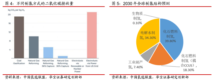 相比灰氢,绿氢在碳排放、制氢纯度、储能等方面更具优势,绿氢替代灰氢是必然趋势。绿氢具备零碳排放的优势,每生产1吨氢气碳排量仅0.03吨;而煤制氢每生产1吨氢气平均需要消耗煤炭约6-8吨,排放15-20吨左右的二氧化碳,此外还会产生大量高盐废水及工业废渣;天然气制氢路线下每吨氢气的生成将排放9-11吨二氧化碳,在双碳目标要求下灰氢势必被更清洁的绿氢所取代。同时,绿氢制氢纯度高,具有明显优异性,适用于对氢气纯度、杂质含量要求苛刻的冶金、陶瓷、电子、航天航空等行业。此外,绿氢储能具有规模大、时间长、储存与转化形式多样等优势,可解决新能源消纳问题。在我国可再生能源发电装机结构占比不断提升的背景下,风光等清洁能源发电成本持续下行为绿氢构建了资源基础,未来绿氢占比有望不断提升。