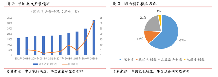化石燃料为制氢主要方式,电解水制氢占比极低。经过多年的工业积累,我国已是世界上最大的制氢国,2021年我国氢气产量约3300万吨。从供给结构来看,由于我国天然气紧缺依赖进口,煤炭资源丰富,目前我国氢气供给仍然以煤制氢为主;根据中国氢能联盟统计,目前煤制氢占比63%,天然气制氢占比13%,工业副产气制氢占比21%,电解水制氢3%。