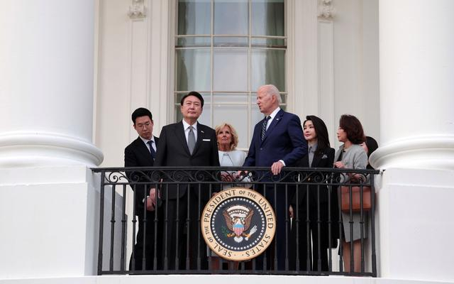 当地时间2023年4月25日,美国首都华盛顿,正在美国进行国事访问的韩国总统尹锡悦携夫人与美国总统拜登和第一夫人吉尔·拜登在白宫阳台上观景。图/IC photo