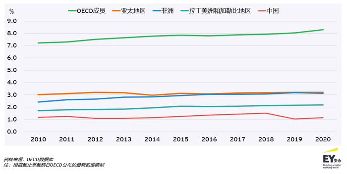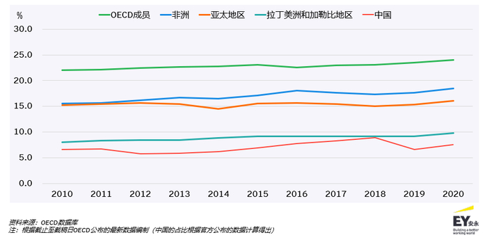 从个人所得税收入占GDP的比例而言,OECD成员平均值从2010年的7.2%增长至2020年的8.3%;亚太地区该期间的占比基本保持在3%左右,其中中国在十年间个人所得税占GDP的比例从发展趋势来看基本未有明显变化(2010年为1.2%,2020年为1.1%,中间有少许波动);非洲地区的占比从2010年的2.4%增长至2020年的3.1%;拉丁美洲和加勒比地区则占比最低,2010年为1.7%、2020年为2.2%。