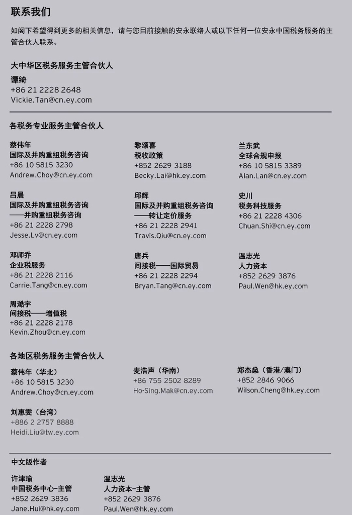 除上述个人税收和移民指南外,安永还持续更新及发布包含企业税、研发激励、财产和遗产相关法律政策、企业和商业领域法律政策、转让定价、间接税等多个领域的各类全球政策汇总指南,我们将及时为您带来最新消息。