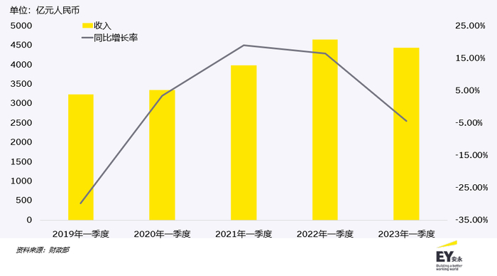 个人所得税收入及同比增长(2019年一季度至2023年一季度)