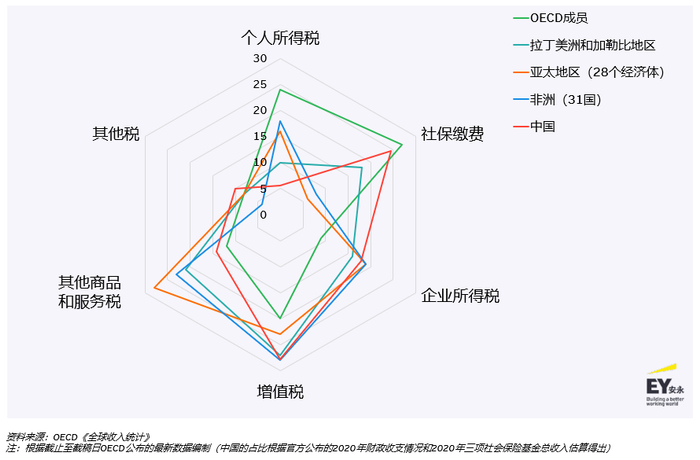 经合组织(OECD)最新版《全球收入统计》5披露的信息也说明了个人所得税在发达经济体的税收收入地位重于其他经济体,由下图可以看出,个人所得税构成了OECD成员的主要税收收入(2020年占比约为24%);而非洲、拉丁美洲和加勒比地区以及亚太地区的经济体,税收收入主要来源于针对货物和服务征收的税(增值税、商品和服务税等)。