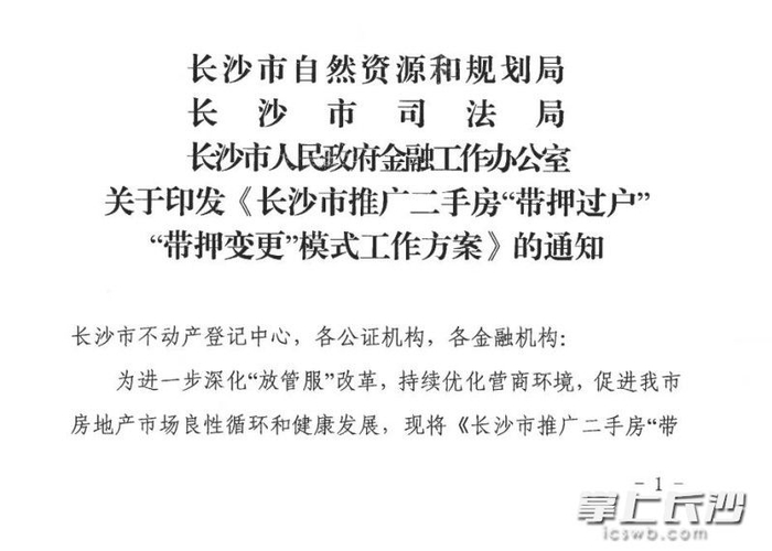 长沙晚报掌上长沙4月27日讯(全媒体记者 刘攀 通讯员 丁伟莉 陈孜孜)长沙二手房“带押过户”模式落地了!今日,长沙市自然资源和规划局、长沙市司法局、长沙市人民政府金融工作办公室联合发布《关于印发<长沙市推广二手房“带押过户”“带押变更”模式工作方案>的通知》。