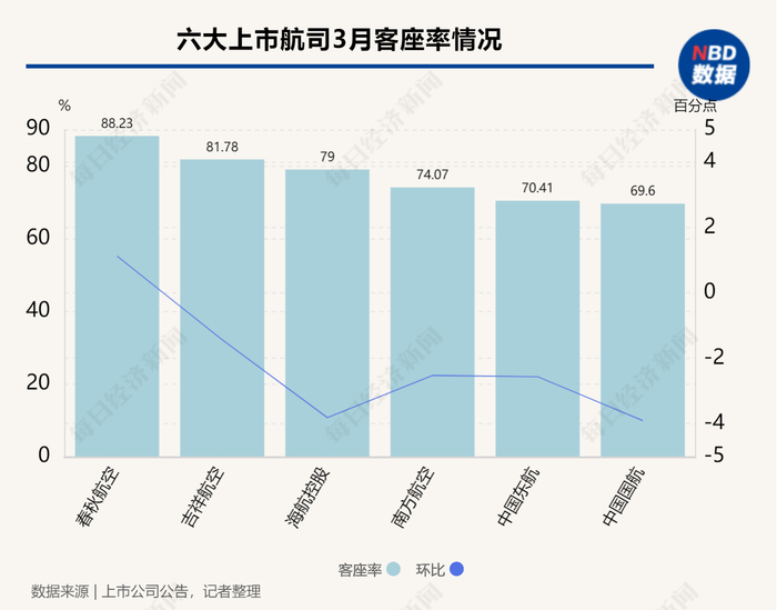 客座率方面,六大上市航司反而普遍出现环比下跌的情况。除春秋航空的客座率相比上月增长了1.13个百分点外,其余5家航司的客座率均有小幅下降。其中,中国国航和海航控股均环比下降了近4个百分点,降幅较为突出。