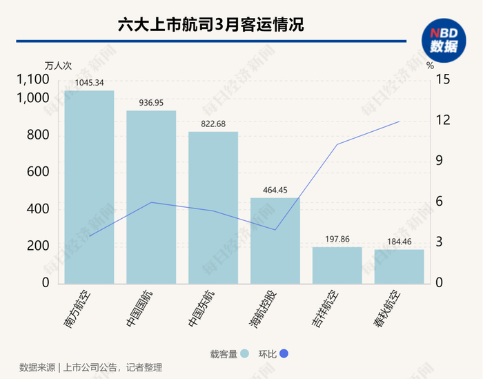 3月,六大上市航司载客量环比均有小幅增长。其中,春秋航空和吉祥航空的环比增幅较高,分别达到11.97%和10.28%。其余4家航司的环比增幅都在10%以下,整体恢复速度进入平缓期。