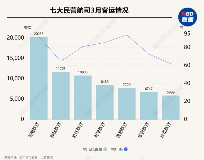 3月,7家民营航司中,海南航空的执飞航班量保持领先地位,并突破2万架次,位居民营航司首位;执行率达到91.98%,位居民营航司第二。2023年以来,海南航空已经连续三月执行率达到90%以上。直至今年3月,也只有两家航司的执行率超过90%,分别为海南航空和首都航空(93.92%)。