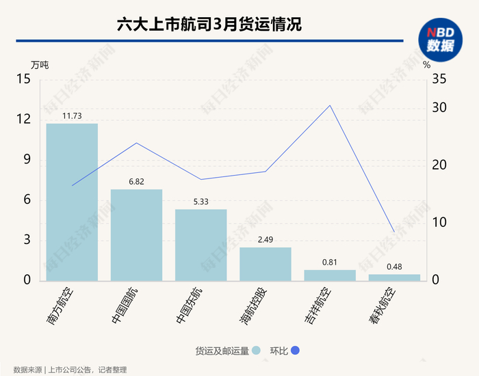 3月,上市航司货运表现回暖,货邮载运量环比普遍增长,按照增幅从大到小排序依次为吉祥航空(30.55%)、中国国航(24.0%)、海航控股(19.02%)、中国东航(17.64%)、南方航空(16.55%)、春秋航空(8.48%),除春秋航空外均实现两位数增长。其中,南方航空的货邮载运量依旧领先,达到11.73万吨。