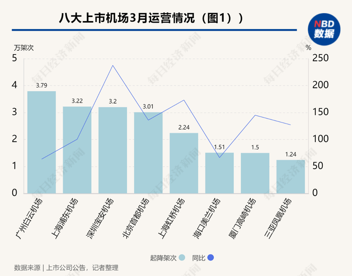 3月机场运输全线回暖,各大机场运营指标呈现高位数上升。从全行业来看,民航局公布的数据显示,3月全国民航机场实现旅客吞吐量9373.8万人次,同比增长195.6%。
