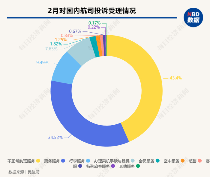 第一,在国内航司方面,2月份受理投诉10292件,投诉类型排名前三位的是:不正常航班服务投诉4466件,占43.39%,主要是旅客对航班取消后无经济补偿不满;票务服务投诉3553件,占34.52%,主要是旅客认为退票收费规则不合理、客票错购后无免费补救措施等;行李服务投诉977件,占9.49%,主要是旅客不接受托运行李破损赔偿标准。