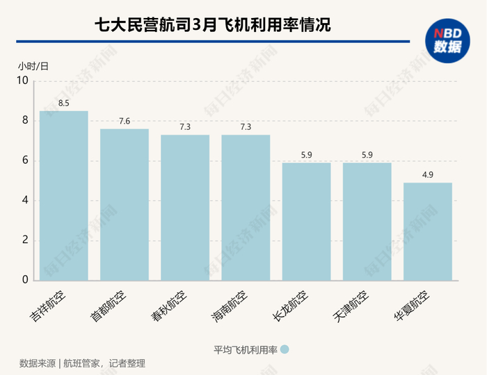 其中,飞机利用水平相对领先的有首都航空、海南航空和春秋航空,这三家航司的平均飞机利用率都达到7小时/日以上;较为落后的是华夏航空,3月平均飞机利用率为4.9小时/日,在7家航司排在末位。