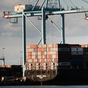 美国新泽西州贝永,货物集装箱堆放在一艘船上。 视觉中国 资料图