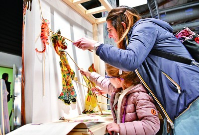 4月25日,在意大利佛罗伦萨举办的国际手工艺展览会上,参观者体验中国皮影文化。
