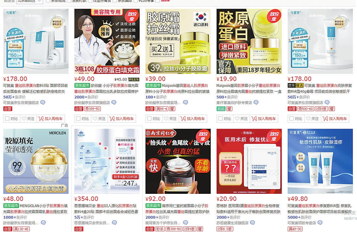图:电商平台上销售的重组胶原蛋白化妆品。 资料图片