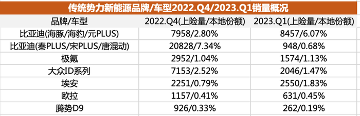 至于其它传统势力的新能源品牌/车型,在上海的销量规模都不大,专营纯电动车的品牌,例如极氪、埃安、欧拉和大众的ID系列,今年一季度份额都有所提升,但由于本身销量规模尚小,这种提升对其整体的市场规模起到的作用有限。