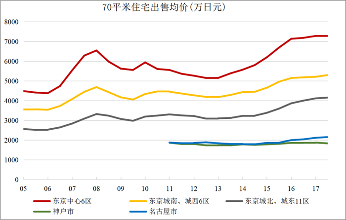 但是考虑到日本20世纪末的房产泡沫,我们从21世纪初再看日本房价走势,仍然是明显的上升趋势,尤其是2013年1月至2017年7月,东京中心6区的70平米住宅出售均价从5153万日元飙升至7286万日元,涨幅41.4%。