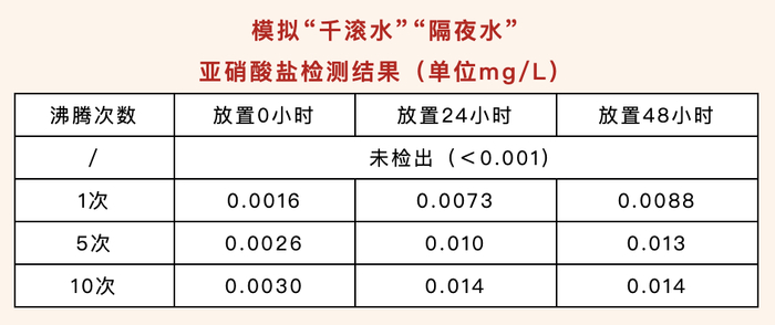 实验发现,随着加热沸腾次数的增加,水中亚硝酸盐含量有略微增加的趋势,放置48小时后亚硝酸盐含量最高为0.014mg/L,但距离我国国家标准生活饮用水中1mg/L亚硝酸盐参考指标限值还很远,所以从这点上来看,所谓的“千滚水”、“隔夜水”是可以放心喝的。