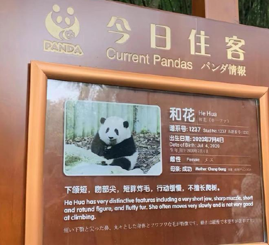 很多游客来这里的主要目标就是来看熊猫界的顶流“花花”。花花,大名叫和花。它因为脖子较短,坐下来的时候像个三角饭团的形象而走红。除了外表可爱,花花也因不善爬树、性格温顺常常被抢食等特点,受到网友宠爱。现在想去看“花花”,需要排很长时间的队。