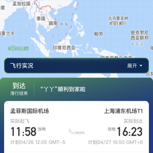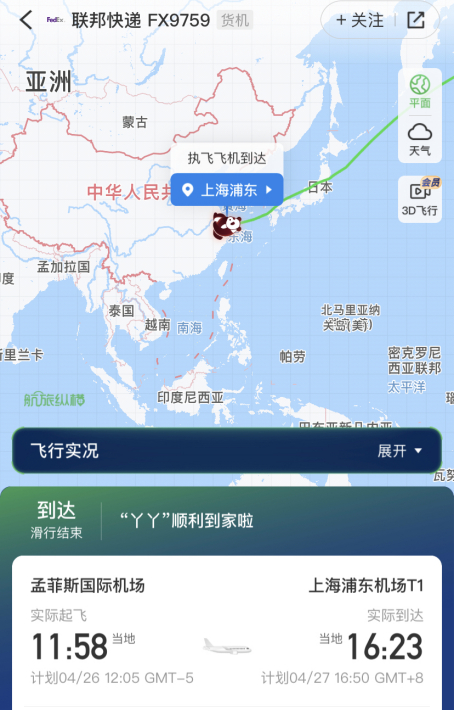 经过近16个小时的飞行,运送旅美大熊猫“丫丫”的货运专机已经于北京时间4月27日16点23分在上海浦东机场降落,比预计时间提前到达。