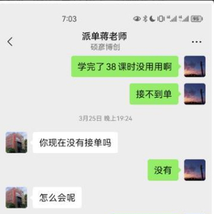 而她学完课程后,发现与宣传中的并不太一样,她根本没有机会接到单。“学生能接兼职单子都是硕士博士一些高难度的论文,对于就学了半年的左右的学生就是不可能。”