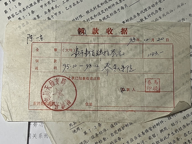 澎湃新闻注意到,每个乡邮员都曾按月缴纳,或从收入里扣除几十、几百元不等的养老保险费。有人至今保留着当年交钱的收据凭证。乡邮员陈一东收藏的收据单显示:1998年12月20日,他缴纳1995年10月至1998年12月养老保险金1143元。收据上盖着“射洪县邮政局天仙支局”印章,收款人为马晓春。