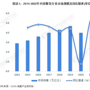 中国餐饮市场规模从2014年的2.9万亿增长至2019年的4.7万亿,年复合增长率达10.1%。2020年受疫情影响,餐饮市场规模下滑15.4至4.0万亿。随着疫情防控常态化,国民消费热情被点燃,2021年餐饮市场规模已恢复至4.7万亿,同比增长18.6%。初步测算,2022年我国餐饮市场规模接近4.8万亿元。