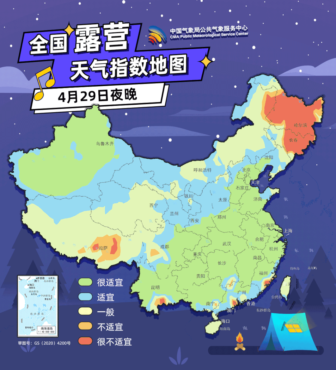 【白天】4月29日,东北南部、华南中西部,5月2日新疆东北部、西藏东部、江南中西部、江淮及重庆东南部、广西北部等地部分地区,5月3日江南北部、江淮南部等地将相继出现不适宜或很不适宜的露营气象等级。