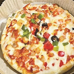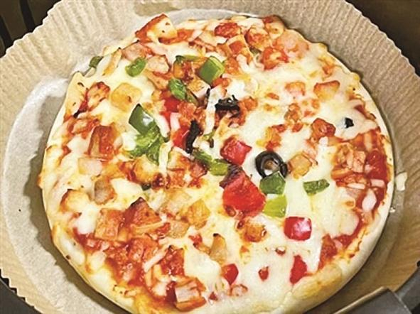 披萨饼底可以买现成的,也可以把吐司擀薄替代,很方便。做披萨的时候,把半成品饼底与马苏里拉奶酪解冻备用,青红椒、洋葱、火腿切丁,洋葱炒熟备用。接下来,饼皮或吐司上刷番茄酱,撒上奶酪,再放蔬菜、肉丁,最后再铺薄薄一层奶酪。放入空气炸锅180℃烤12分钟,美味披萨就出炉啦。