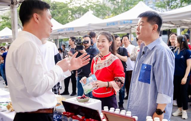 乡村守护人@小田姑娘(中)和@主持人肖东坡(右)在市集与助农企业代表交流