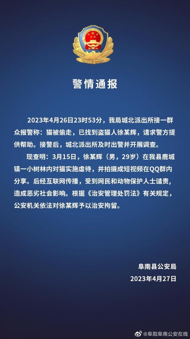 4月27日,@阜阳阜南公安在线 通报称,公安机关已对偷猫虐猫的男子徐某辉予以治安拘留。