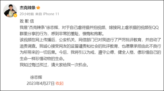 我是“杰克辣条”徐志辉,对于自己虐待猫并拍视频、嫁接网上虐杀猫的视频在QQ群里分享的行为,感到非常的羞耻、懊悔和抱歉。