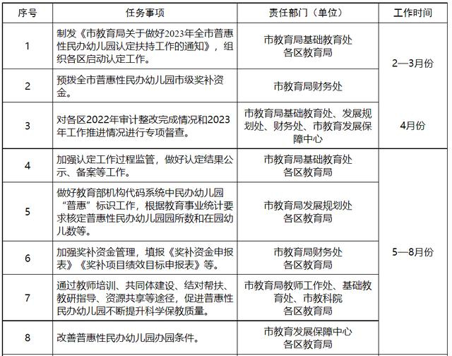 2023年全市普惠性民办幼儿园认定和扶持工作任务清单