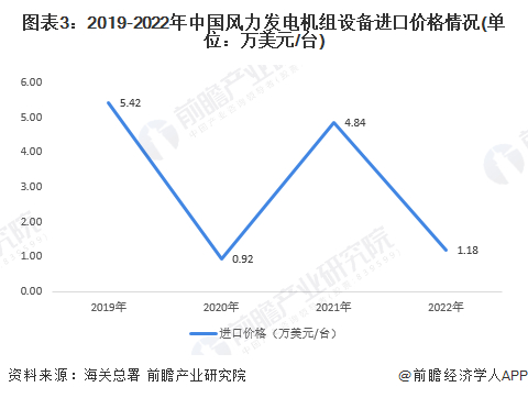 2019-2021年我国风力发电机组设备进口均价呈现波动态势。2019年风力发电机机组设备至5.42万美元/台;2020年由于贸易环境恶化,进口价格降低至0.92万美元/台;2021年随着国内疫情稳定,进口价格有所上升,为4.84万美元/台;2022年风力发电设备机组均价再次下降至1.18万美元/台。