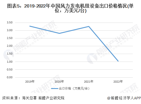 2019-2022年我国风力发电机组设备出口均价波动下降。2019年出口价格为3.27万美元/台,到了2022年中国风力发电机组设备出口均价为1.05万美元/台,单价金额大幅下跌。