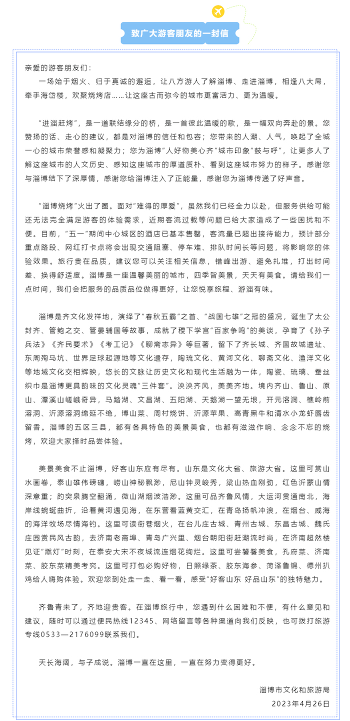 “烤城”淄博,最近算是住在微博热搜上了。4月26日,淄博发出了一封“劝退”信冲上热搜,情真意切的“劝退”信不仅获得了网友们的支持,还给“好客山东”吸引了一大波游客,把大家对淄博的好感度推上了一个新高度↓↓↓
