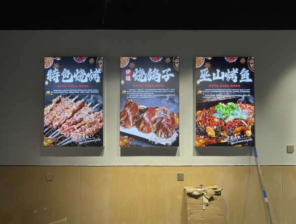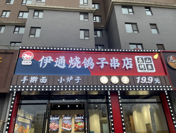 27日18时50分,位于长春市会展大街与昆山路交会处的一家“伊通烧鸽子串店”内一片灯火通明。“这不马上五一了吗?趁着假期前赶赶进度,装修已经进入收尾阶段了,争取五一开业。”串店王老板对记者说。进入店内,首先映入眼帘的便是三张有特色的海报,一个是特色烧烤,主打肉串;一个是伊通烧鸽子;另一道菜便是巫山烤鱼。