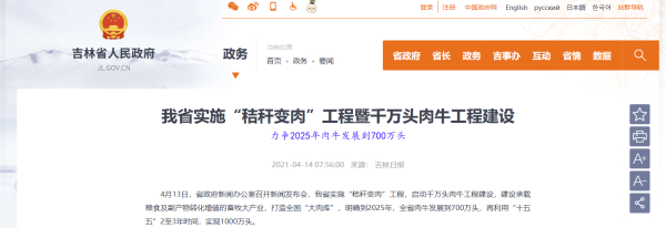 据吉林省人民政府新闻办公室新闻发布会:2021年4月13日,我省实施“秸秆变肉”工程,启动千万头肉牛工程建设,建设承载粮食及副产物转化增值的畜牧大产业,打造全国“大肉库”,明确到2025年,全省肉牛发展到700万头,再利用“十五五”2至3年时间,实现1000万头。