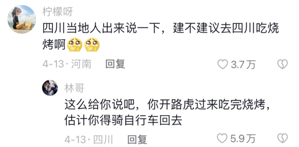 从淄博烧烤爆火出圈,到各地烧烤出战,一时之间“烽烟四起”。网友的看法也各不相同,大江南北,段子高手也是各显神通。比如在四川烧烤申请出战之时,一位四川的网友回怼:这么给你说吧,你开路虎过来四川吃完烧烤,估计你得骑自行车回去。网友们你来我往,好不热闹,足可见“战火”激烈。