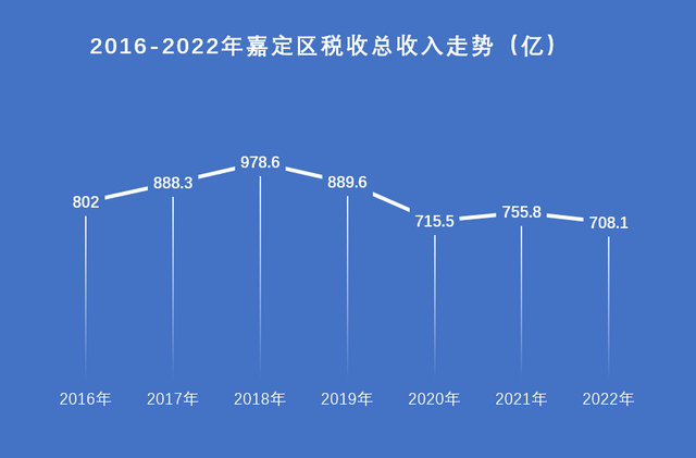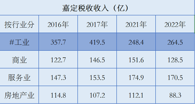与此同时,相较2016年、2017年,嘉定2021年、2022年的工业税收也明显收缩,进而全区税收总收入受到影响。例如,单看嘉定2021年与2017年,两者税收差距主要发生在工业中,2021年的工业税收较2017年,收缩170.6亿。