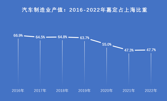 这四年间,嘉定在上海汽车制造上的比重明显逐年下滑。尽管其比重2022年略有回升至47.7%——它仍是上海的近半壁江山,但与嘉定自己相比,47.7%距离2016年占比达66.9%已收缩近20个百分点。