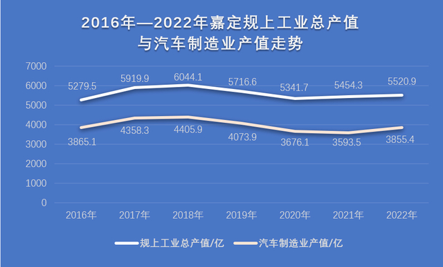 受制于支柱产业汽车制造业的增长乏力,甚至收缩,自2016年以来,嘉定规上工业产值维持在5000亿—6000亿水平波动,态势胶着。