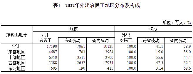 在外出农民工中,跨省流动7061万人,比上年减少69万人,下降1.0%;省内流动10129万人,比上年增加87万人,增长0.9%。从输出地看,中部地区跨省流动农民工占外出农民工的比重为55.6%,西部地区为47.5%,东北地区为31.4%,东部地区为15.0%。